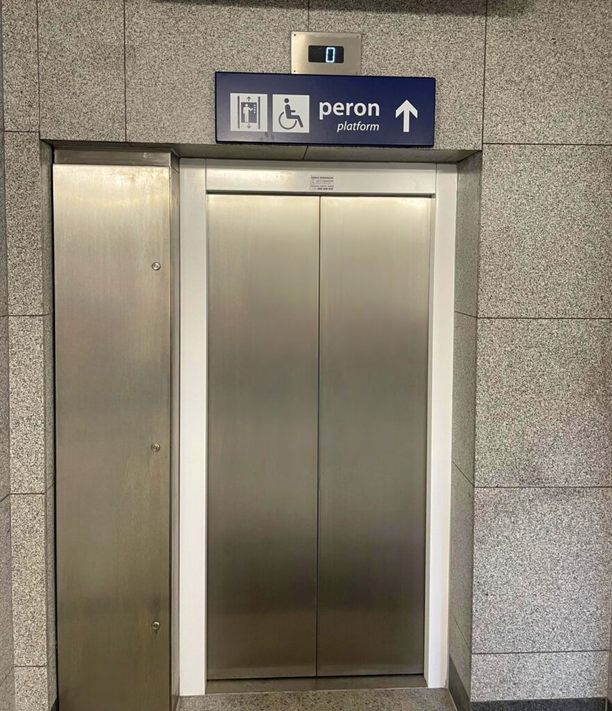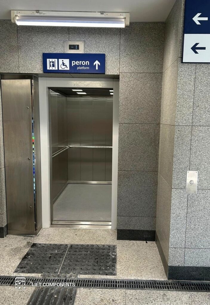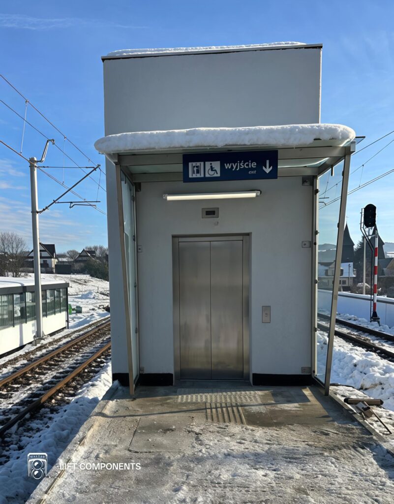 Dźwig osobowy, winda typu DBM1400 – stacja kolejowa PKP Rabka 2025, zgodny z Ipi-1 Wytyczne architektoniczne dla infrastruktury pasażerskiej oraz normami PN-EN81-70 oraz PN-EN81-71